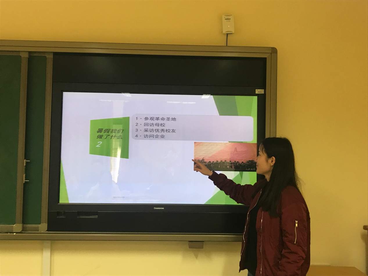 随后,阿尔巴尼亚语班班长王新雨围绕着“参观革命圣地、回访母校”活动和大家分享了她在暑期的社会实践活动,通过走访了郑州、开封等红色革命传统较为悠久的地市,通过瞻仰革命先烈纪念馆,参观红色革命遗迹等方式,唤醒了自身爱国主义情怀,不忘祖辈教诲、心系故乡发展、紧跟时代步伐。在此基础之上,向大家提议要注重对社会责任感的培养。