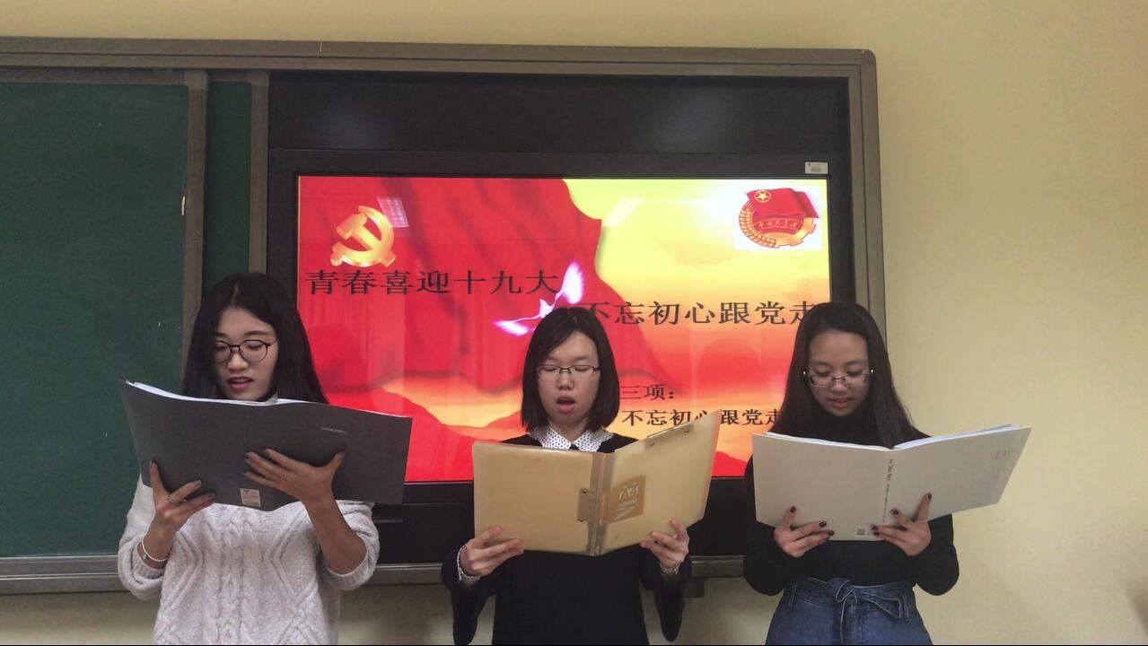 接着,周雨卉、贾文荟和刘维航同学就“青春”和“初心”主题,为大家朗诵了《中国少年说》。伴随着雄浑的背景音乐,三位同学开始了朗诵。她们声音高亢洪亮,振奋人心。正如文中所说:“天戴其苍,地履其黄。纵有千古,横有八荒。前途似海,来日方长。美哉我少年中国,与天不老!壮哉我中国少年,与国无疆”,三位同学用诗朗诵的形式,表现了当代青年学生积极进取的青春朝气和对祖国的深深热爱!