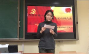 十一月十二日晚五时,17级荷兰语全体同学在逸夫楼413教室开展了本学期第三次团活动-“青春喜迎十九大 不忘初心跟党走”主题班会。熟悉的团歌奏响,全体同学起立,齐唱团歌后,在团支书贾文荟组织下班会正式开始。本次班会一改往日严肃的氛围,以活跃的精神面貌,创新的活动形式,最大化地激发了同学们爱国情怀,和建设社会主义事业的伟大决心。由于仍然身处学校,与社会校外社会的联系不深,为了引导同学融入团活动氛围,增加对十九大精神的了解,团支书精心选取了”画说党史””解读十九大精神”等一系列优秀的纪录片,以同学们感兴趣的漫画形式,将共产党自成立以来曲折前进的历史一一诉说,耳熟能详的爱国歌曲萦绕耳畔,一幅幅感人至深的画面映入眼帘,迅速地调动了同学们的情绪。”党的全国代表大会”一片简略概括了十九大的中心思想,为同学们理清了中国未来的发展方向,为!学们各抒己见做出了良好的铺垫。