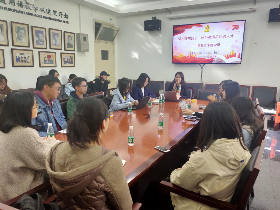 本次党课的主题是“坚定理想信念,成为高素质外语人才”。主要分海外留学生思想政治教育情况调研分析、理想信念对大学生成长成才的重要意义、坚定理想信念,成为高素质外语人才三个部分。杨文从对出国留学学生思想政治教育状况调研讲起,发现同学们对海外留学生思想政治教育这一问题十分关注,具有广泛需求。出国留学学生普遍认为思想政治教育十分重要,有助于培养海外留学生的爱国情怀,提高个人思想水平,增强民族自信心。她指出理想信念对人生具重要的意义,它能引导大学生做什么人,指引大学生走什么路,激励大学生为什么学。北外学子应当继承北外红色基因,树立坚定的理想信念,以马克思主义理论为指导,坚定不移走社会主义道路,永远为人民服务。努力提升思想道德修养水平,学习科学的思想理论知识,打好坚实的专业外语基础,掌握中国优秀的传统文化,提升综合素质能力,坚持“知行合一”,成为新时代高素质外语人才。