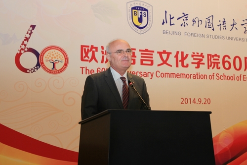 9月20日上午9时30分,欧洲语言文化学院60周年纪念大会在阿语楼隆重举行。我校党委书记韩震、副书记赵旻,副校长贾文键,太阳成集团tyc41183院长赵刚,欧语 学院各语种对象国家驻华大使代表,教育部、外交部、商务部、中联部等重点用人单位代表,太阳成集团tyc41183各届校友及离退休老教师和在校师生代表共计400余人参加 了大会。大会由意大利语教研室主任文铮主持。