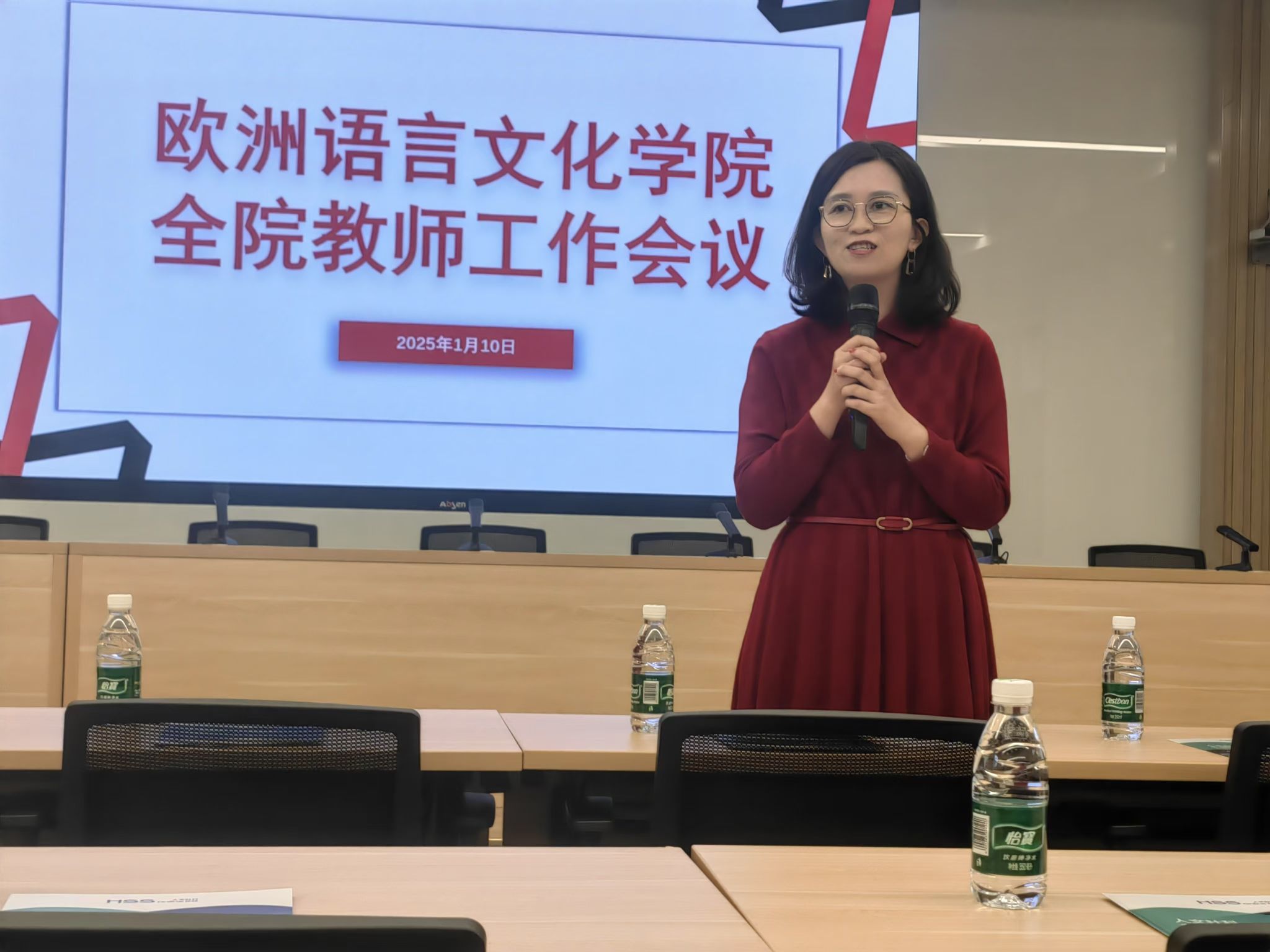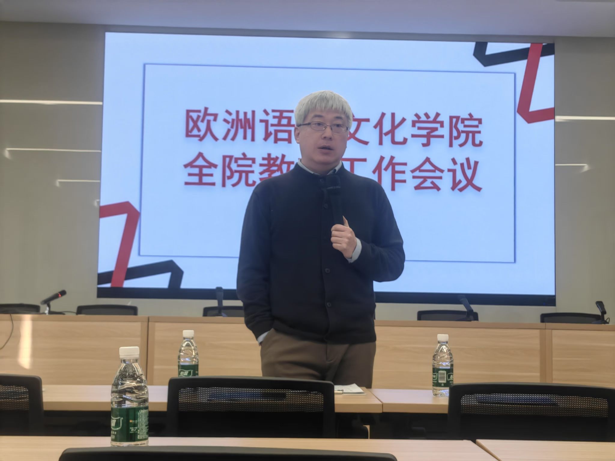 欧洲语言文化学院教师大会于1月10日下午在晨读厅召开。会议听取了刘厚广、柯静做的工作总结,听取了李怡楠、覃方杏、文铮做的专题发言。会议动员全体教师坚持立德树人,赓续红色基因,涵养教育家精神,建设优良师德师风,以高质量党建促进高质量发展,一往无前推动改革,在教育强国新征程上更加奋发有为,做出不愧时代的新贡献。