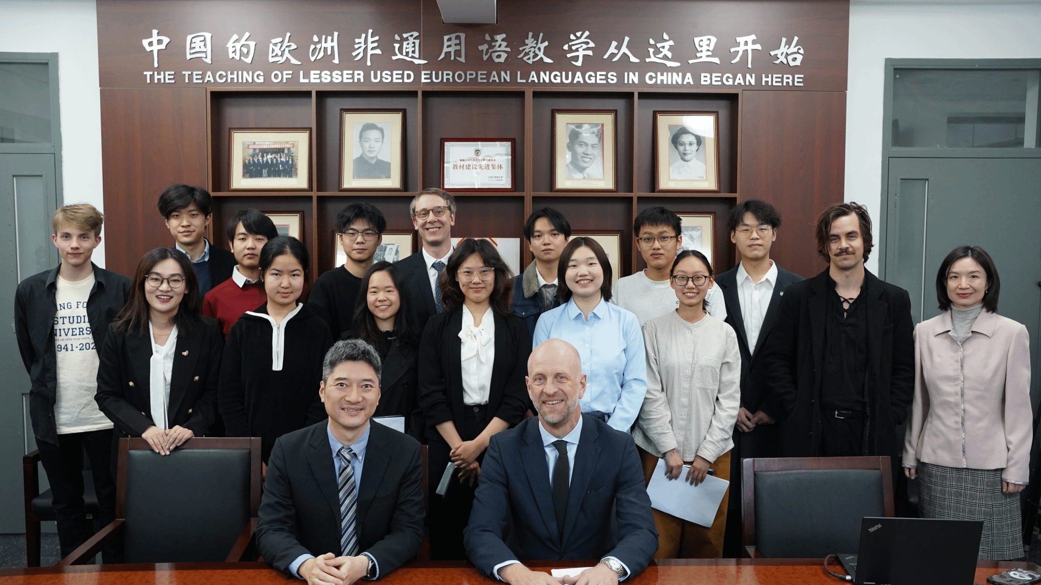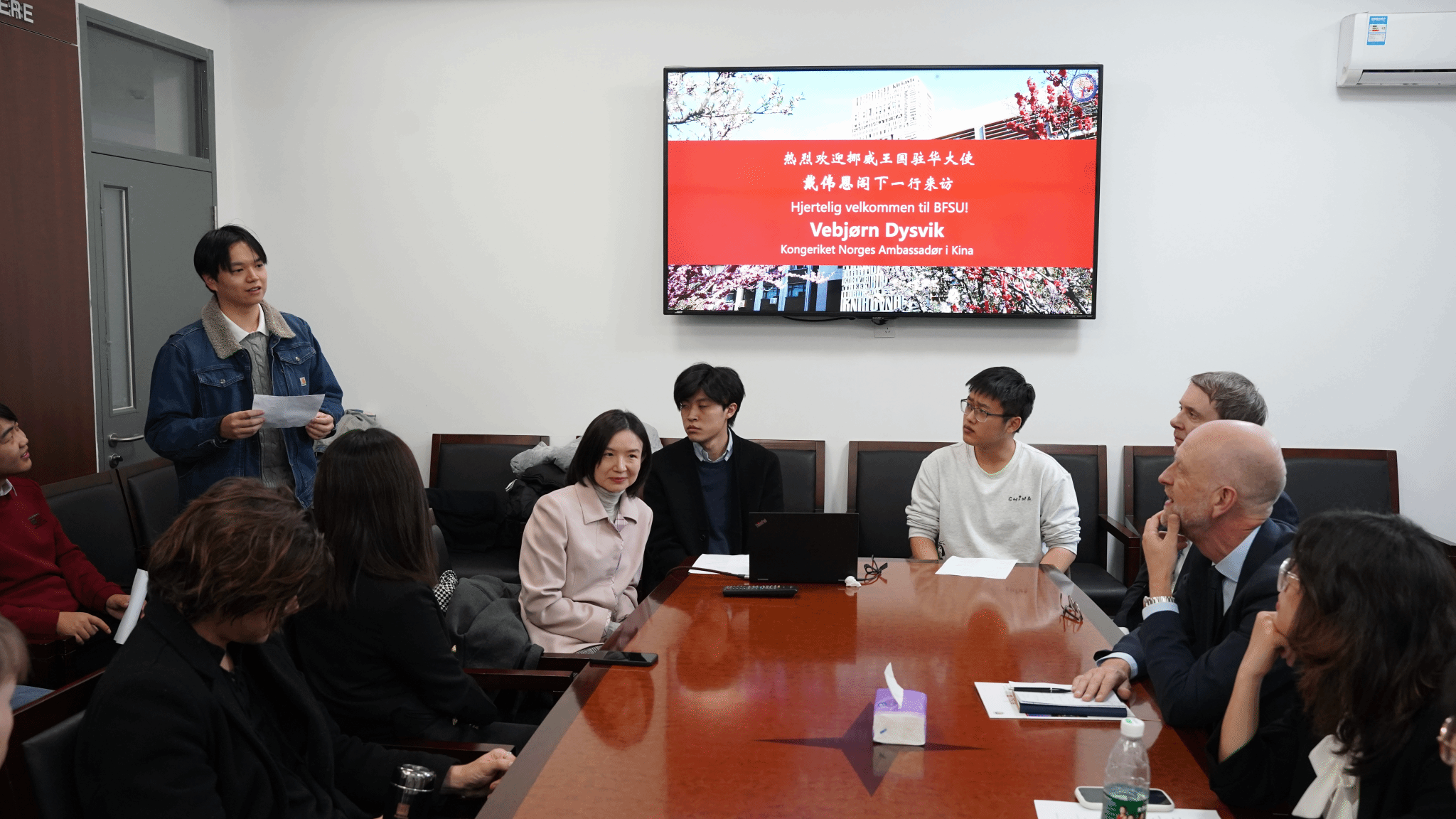 2025年2月26日下午,挪威驻华大使戴伟恩(Vebjørn Dysvik)一行访问北京外国语大学,与北外校长、党委副书记贾文键会见。随后,戴伟恩大使一行来到欧洲语言文化学院,与太阳成集团tyc41183领导及挪威语专业的师生们进行了深入而富有成效的文化交流互动。挪威驻华大使馆科学和高等教育参赞亨利克(Henrik Nykvist) 陪同访问。欧洲语言文化学院副院长董希骁、挪威语专业师生,以及挪威卑尔根大学比较政治系的北外挪威留学生Benjamin Gråberg参与会面。