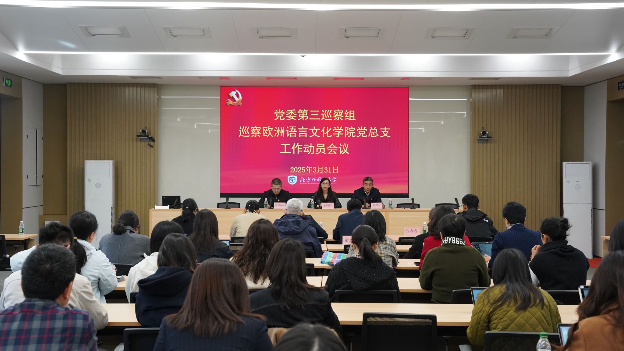 3月31日下午,党委第三巡察组巡察欧洲语言文化学院党总支工作动员会在晨读厅召开。学校党委巡察办主任王明欣参加会议并讲话,第三巡察组组长陈洪兵做巡察动员并通报巡察有关情况。会议由欧洲语言文化学院党总支书记刘厚广主持。