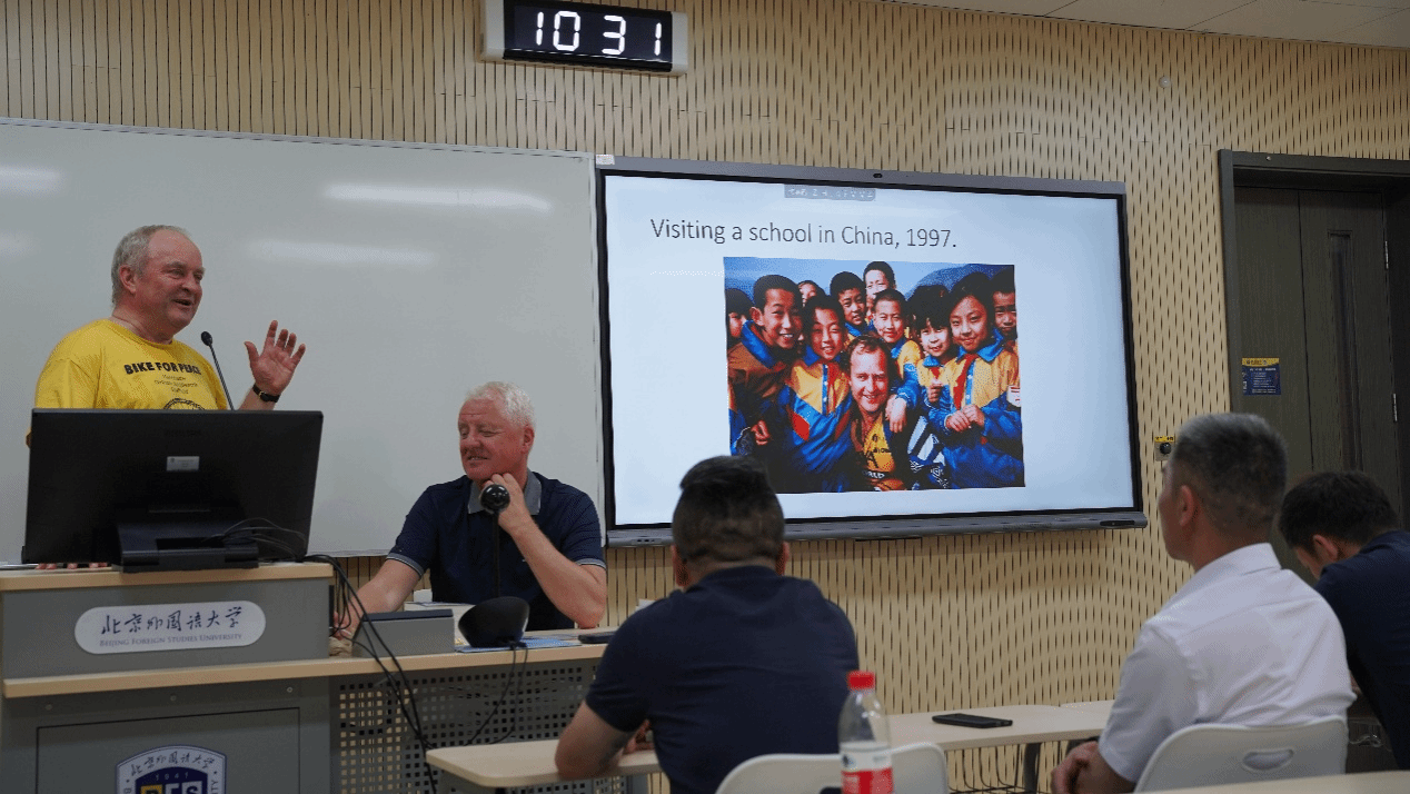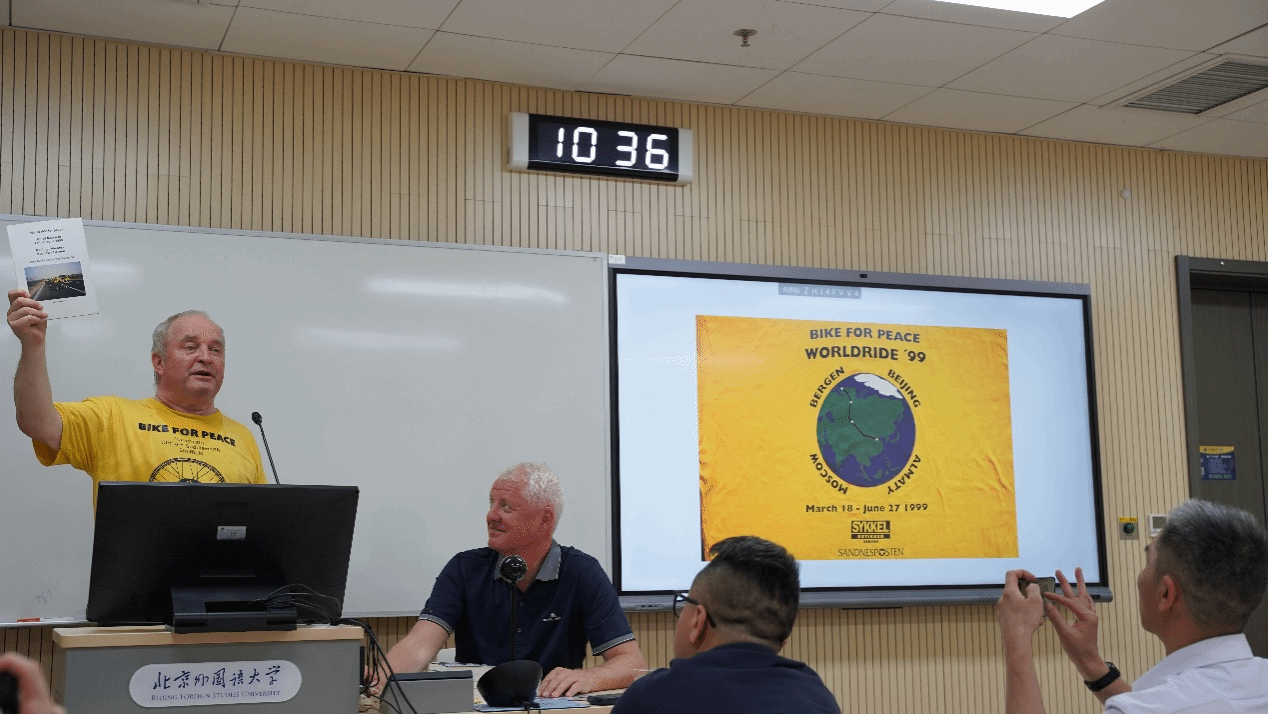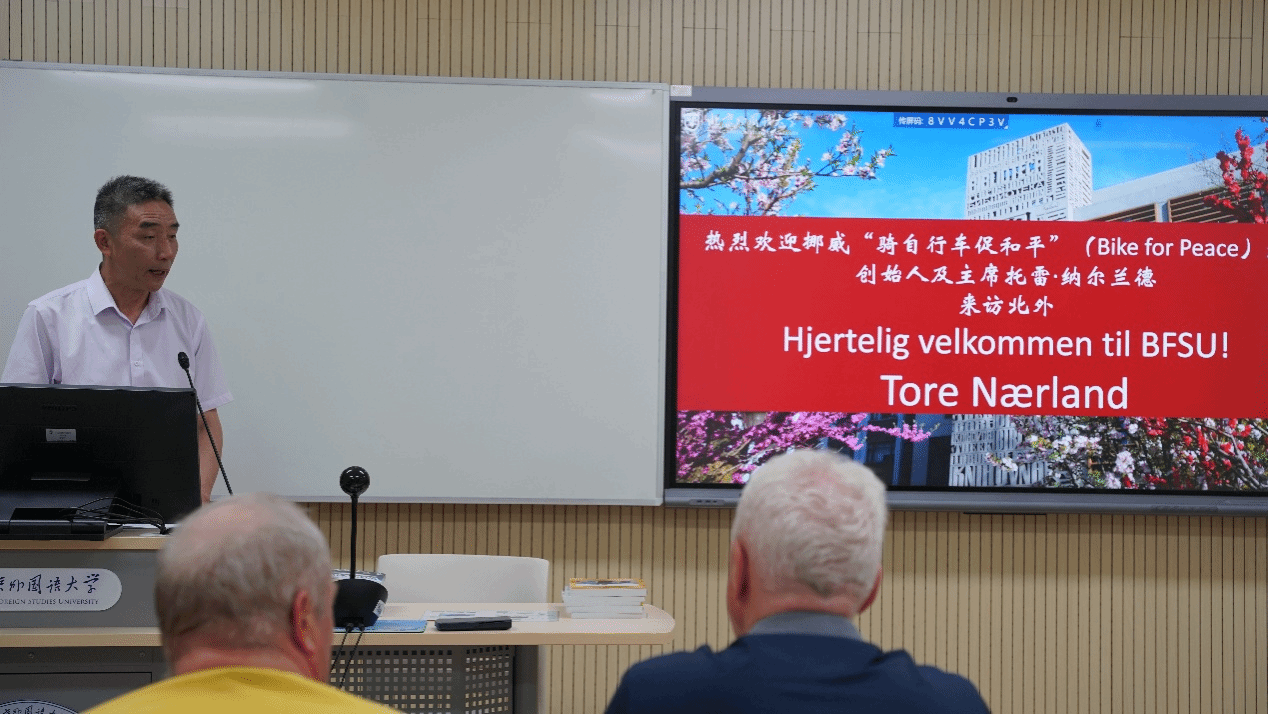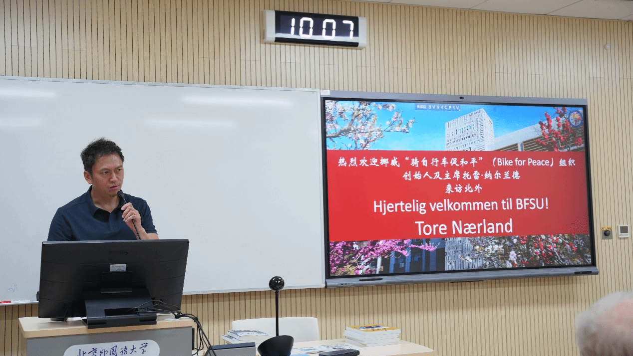 托雷·纳尔兰德先生是“骑自行车促和平”组织的创始人和主席,是挪威知名友华人士。他向在场师生讲述了自己 1999年从北京到卑尔根的骑行经历,介绍了途经中国、哈萨克斯坦、俄罗斯、芬兰、瑞典和挪威时的所见所闻。他用生动的语言和丰富的图片,让师生们身临其境,感受了一次跨越亚欧大陆的骑行之旅。