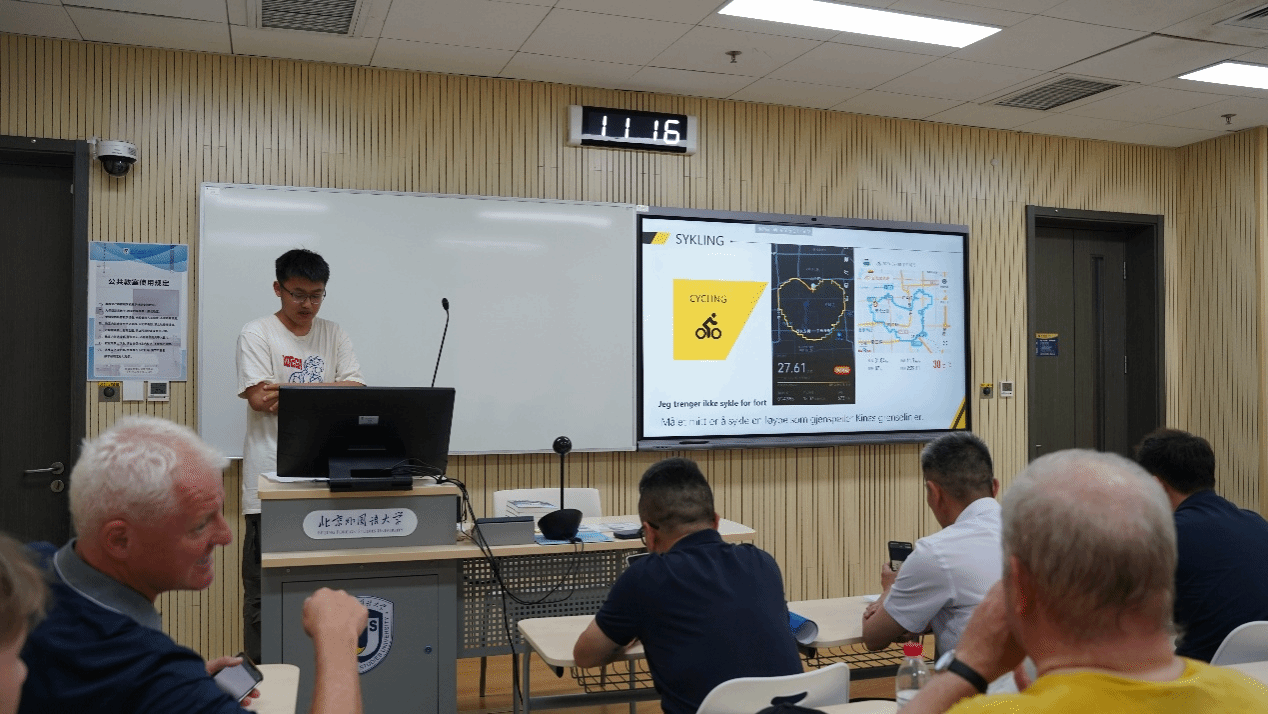 现场师生与托雷·纳尔兰德先生就骑行经历、文化交流、和平理念等方面展开热烈讨论。活动过程中,挪威语专业学生为嘉宾们准备了精彩节目。李昶乐用挪威语分享中国骑行爱好者的故事和经验,王舒瑶带领大家演唱了挪威歌曲《索尔维格之歌》以及挪威语版北京冬奥会主题曲,挪威语专业学生用挪威语表达了他们对挪威语学习的热爱和对中挪文化交流的期待。