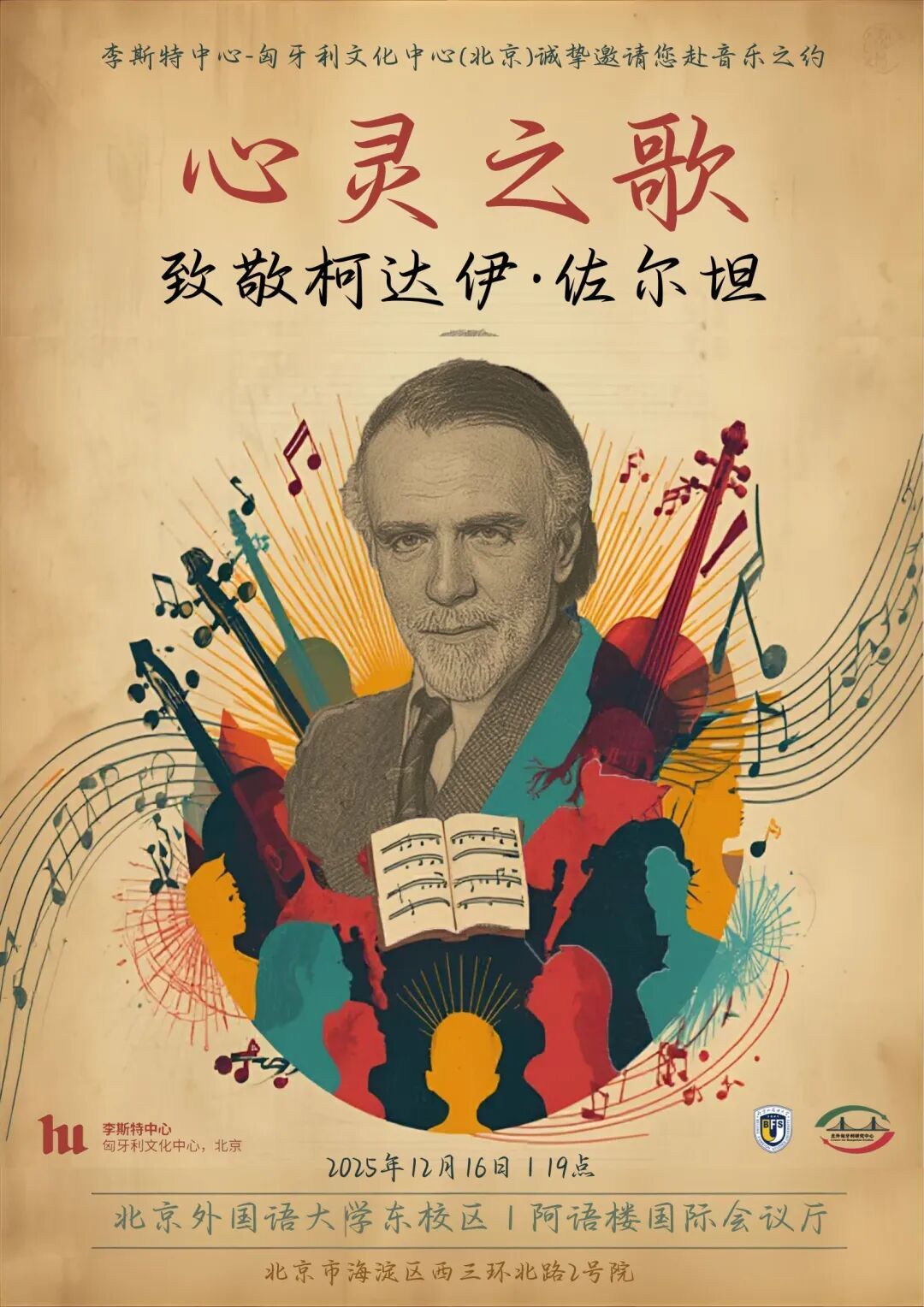 2025年12月16日晚,“心灵之歌——致敬柯达伊·佐尔坦”音乐会在北京外国语大学举行。音乐会以柯达伊·佐尔坦诞辰143周年为契机,通过音乐演出的形式,向这位在世界音乐创作与音乐教育领域具有深远影响的作曲家和教育家致敬。