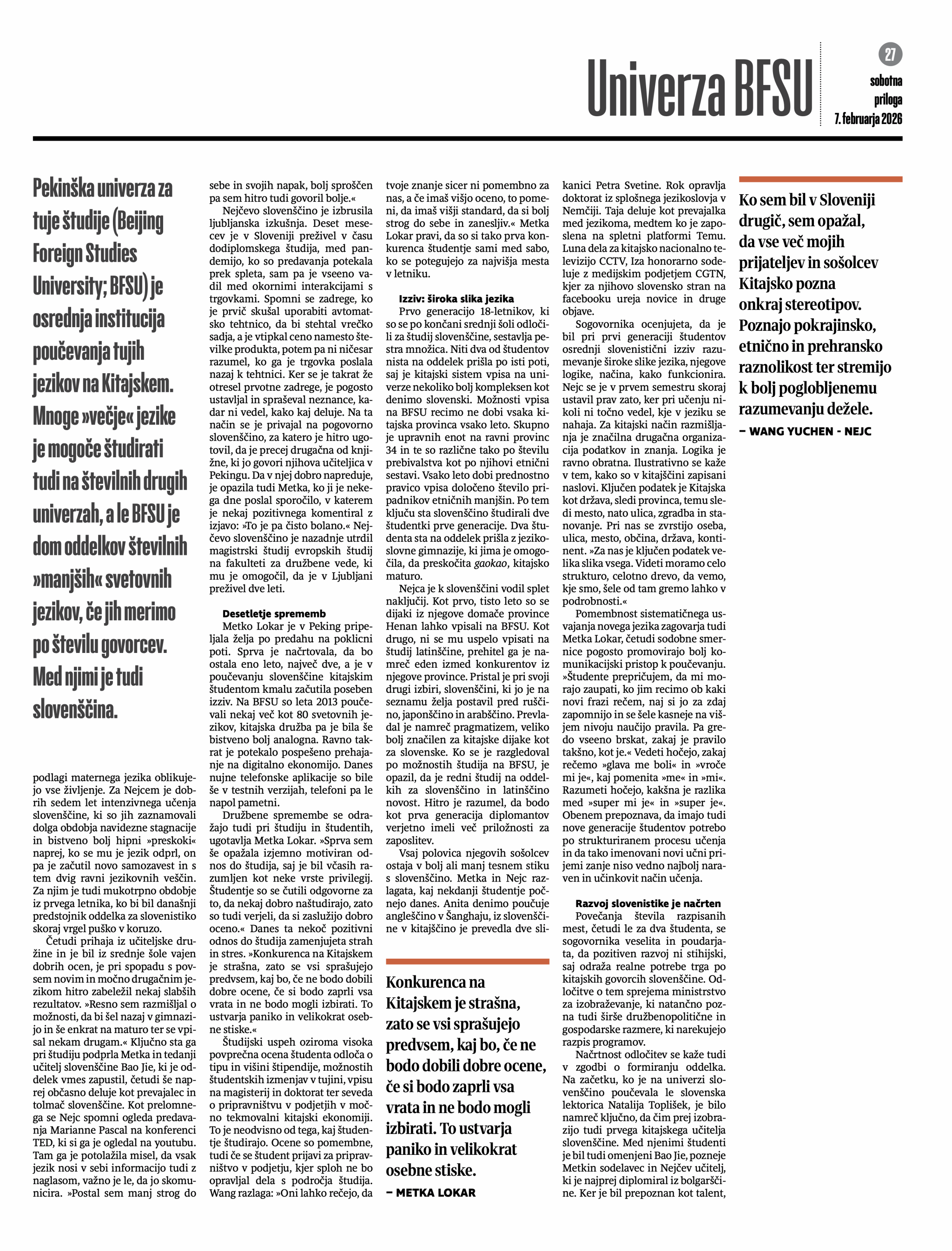 《劳动报》创刊于1959年,是斯洛文尼亚发行量最大、影响力最广的全国性综合日报之一;其周六专栏《Sobotna priloga》以深度报道、人物专访和文化评论见长,在斯洛文尼亚社会具有广泛读者基础和重要舆论影响。此次专访的刊发,进一步提升了北外斯洛文尼亚语专业及学校在斯洛文尼亚主流媒体中的知名度和影响力,也为中斯人文交流与学术合作注入了新的活力。