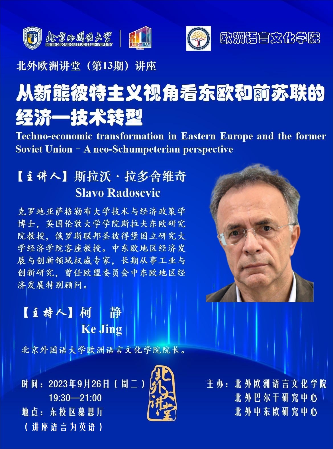2023年秋季学期“北外欧洲讲堂”即将开启。第一场讲座将于9月26日(周二)举行,我们邀请到的主讲嘉宾是英国伦敦大学学院斯拉夫东欧研究院教授斯拉沃·拉多舍维奇(Slavo Radosevic),他带来的讲座题目是《从新熊彼特主义视角看东欧和前苏联的经济—技术转型(Techno-economic transformation in Eastern Europe and the former Soviet Union – A neo-Schumpeterian perspective)》。