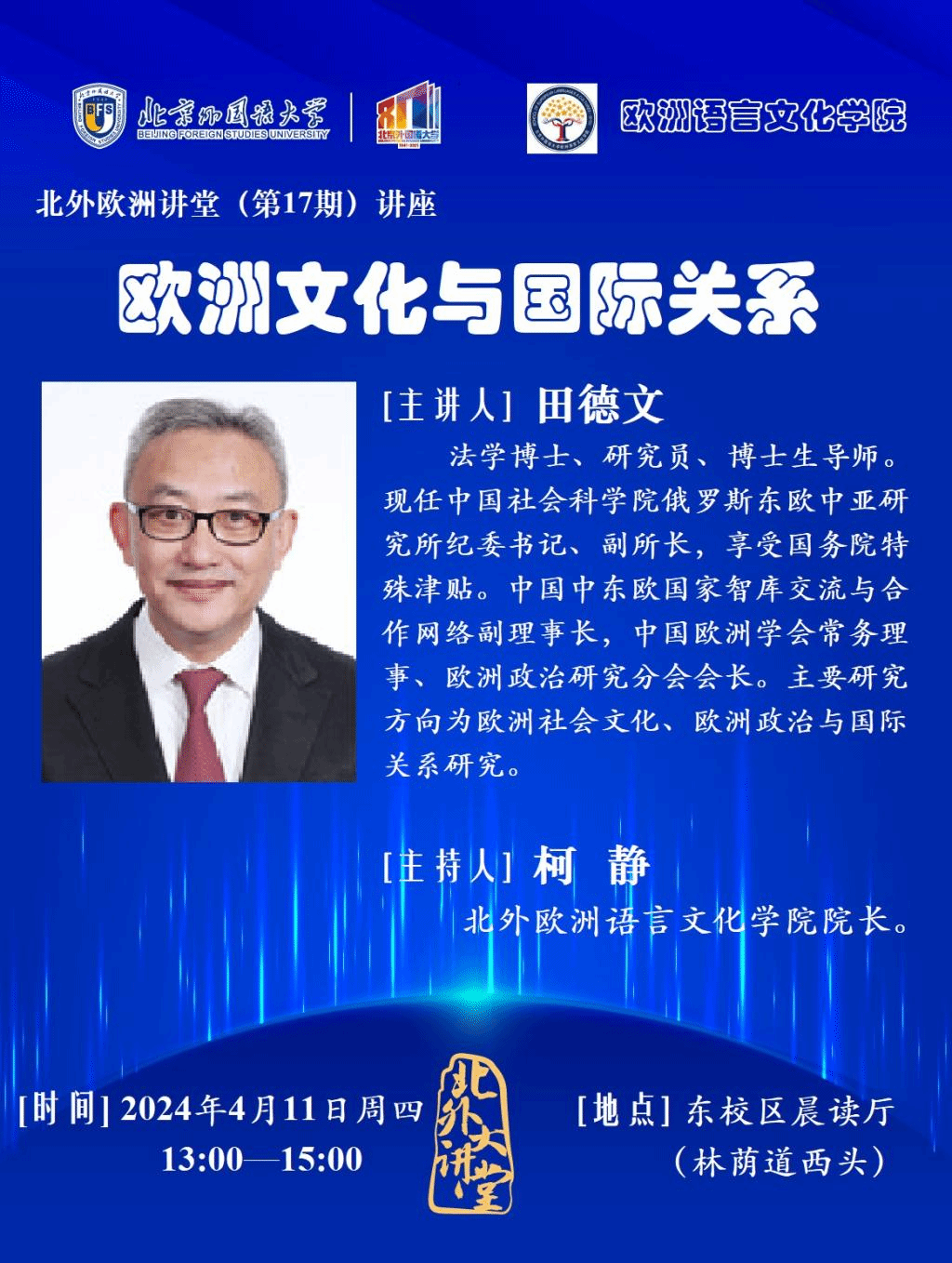 2024年春季学期的“北外欧洲讲堂”即将开启。4月11日,本周四,我们将邀请中国社会科学院俄罗斯东欧中亚研究所田德文研究员做客“北外欧洲讲堂”,为大家带来题为《欧洲文化与国际关系》的讲座。