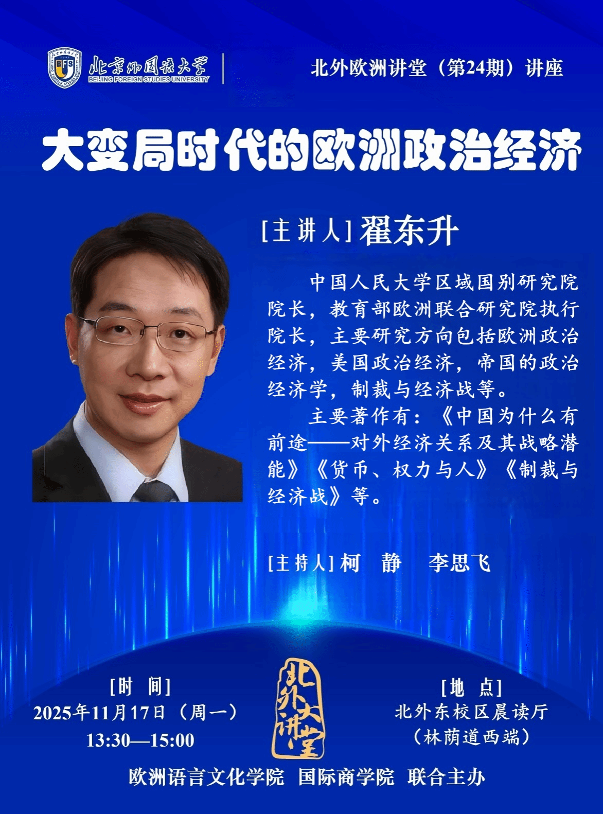 本次讲座题为《大变局时代的欧洲政治经济》,将由欧洲语言文化学院与国际商学院联合主办。讲座时间为2025年11月17日(周一)13:30—15:00,地点在北外东校区晨读厅(林荫道西端)。欢迎全校师生参加。