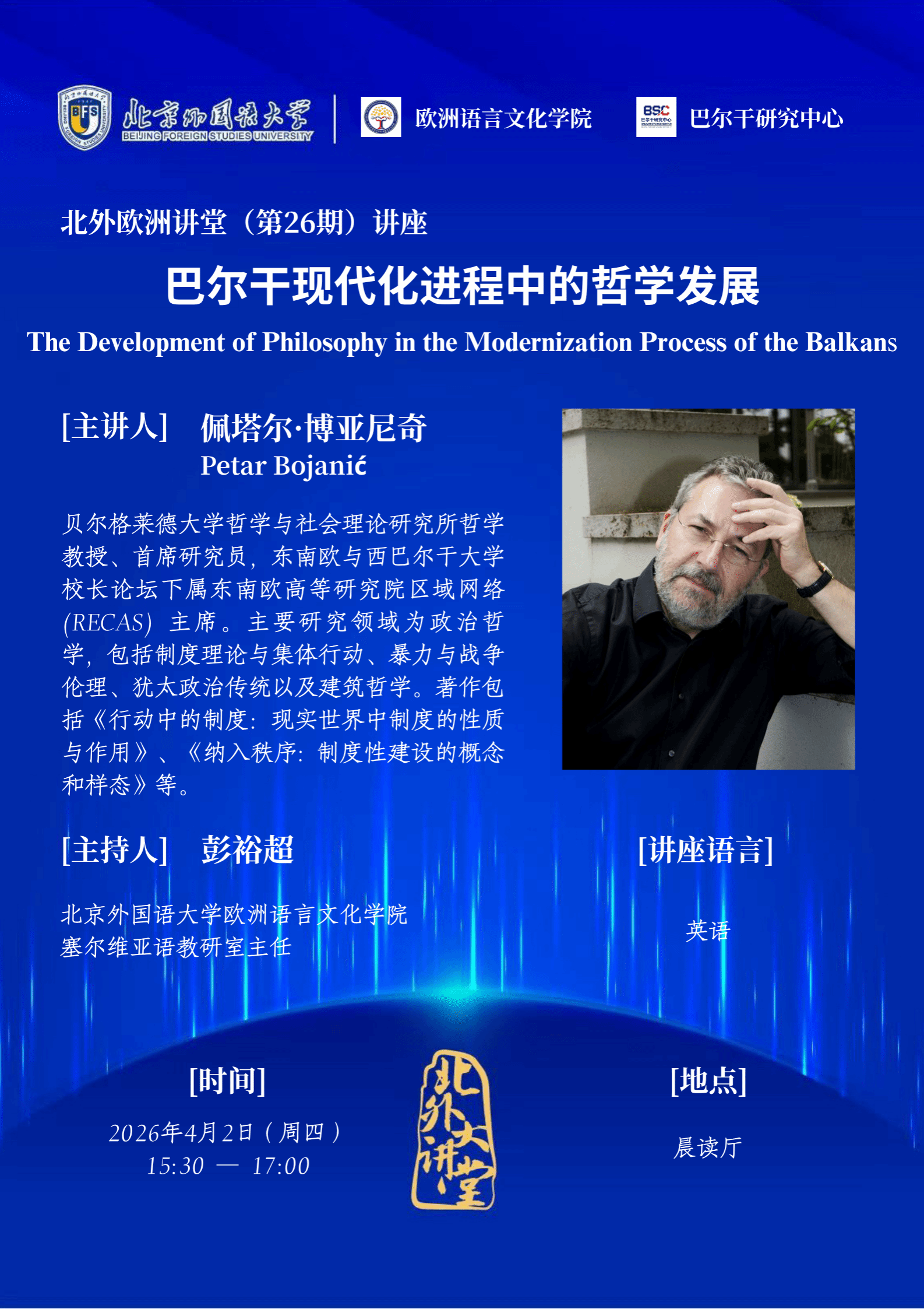 2026年4月2日(周四),北外欧洲讲堂将邀请塞尔维亚贝尔格莱德大学教授佩塔尔·博亚尼奇(Petar Bojanić)为北外师生作题为《巴尔干现代化进程中的哲学发展》的讲座。