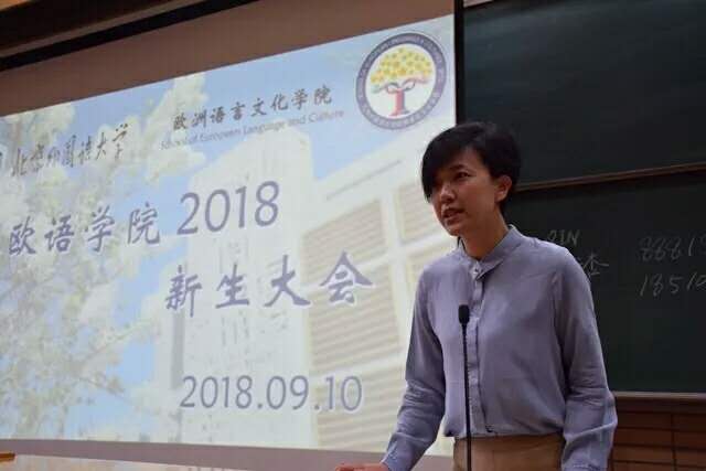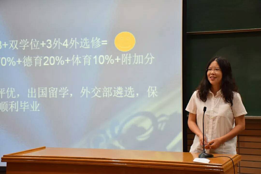 林温霜老师对学院人才培养和一系列综合教学改革做了详细说明。为了培养复语型、复合型人才,学校和学院进行了一系列教学改革,除了专业课,同学们还可以选修双学位。学院针对学习特别优秀的同学设立了战略高端班,此外学院还设立了院系平台课,启动欧洲非通用语法学和商务特色班,扩大同学视野。她对专业学习提出了宝贵建议。希望同学们根据个人的实际情况选择三外、双学位和特色班的课程,充实度过大学四年时光。
