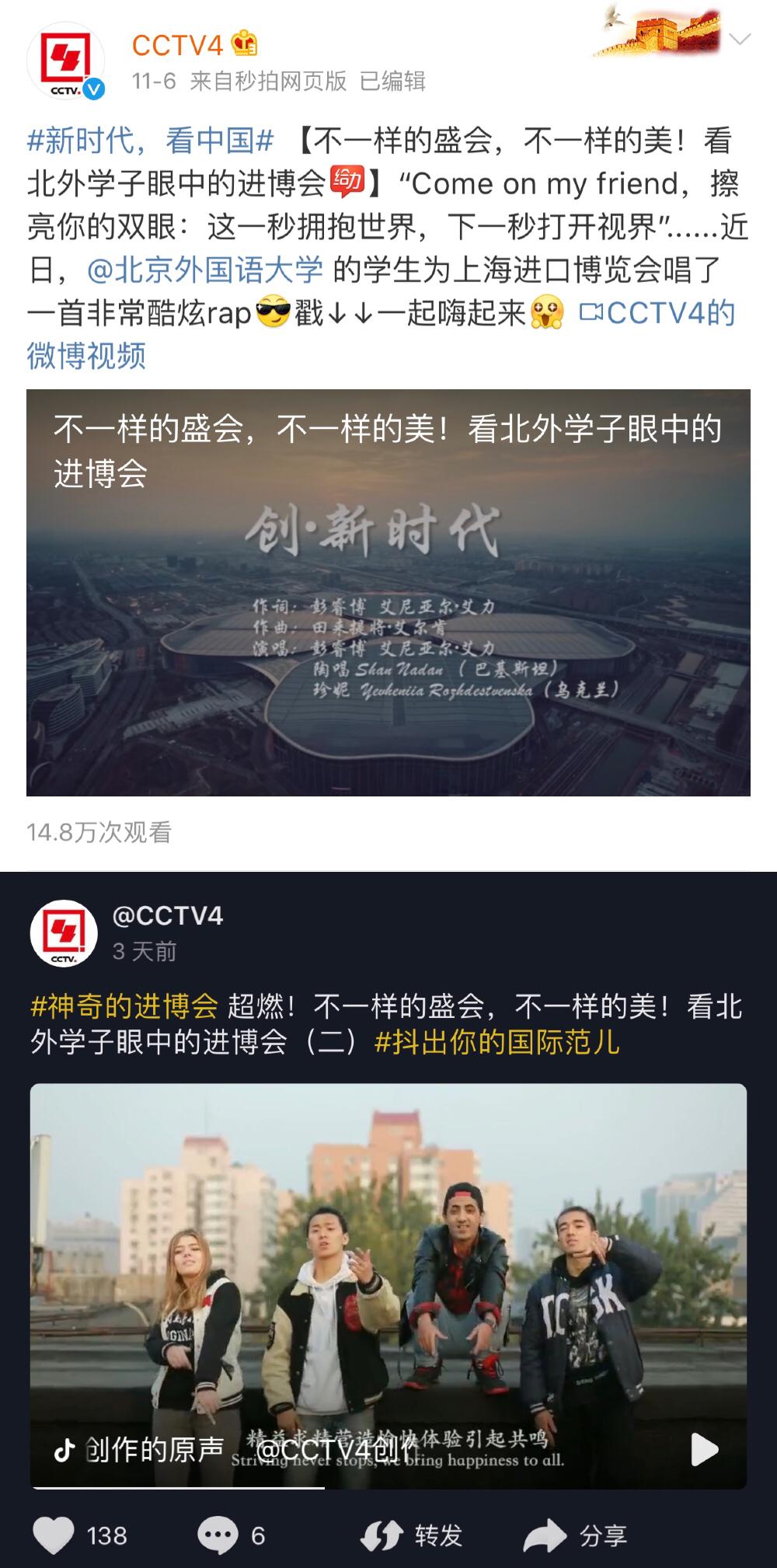 11月7日上午9:00,这条MV在CCTV4——中央电视台的国际台播放。至此,《创·新时代》的传播范围已经扩大到全国乃至国外,获得了广泛关注。这充分展现了BFSUers的精神面貌和源源不断的创新活力,也使北外再一次在全国以至国际化舞台上大放异彩。