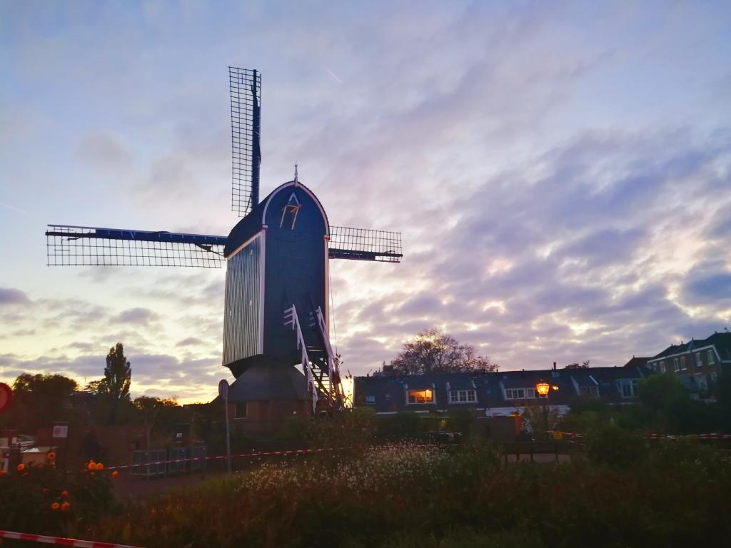 Als we over Nederland spreken, denken we aan windmolen. Als een laag land is Nederland afhankelijk van molens, die door het hele land te vinden zijn. Deze molens werken voortdurend al het overtollige water weg, zodat het land niet door het zeewater overloopt. De foto wordt genomen in Leiden, een rustige, mooie universiteit stad. De windmolen staat tegen Rivier Rijn, daarover is de oude woning van Rembrand. Het is in Nederland altijd bewolkt en regenachtig. Vooral in de winter, wordt het steeds minder mogelijk om een mooie zonsondergang te zien. Soms zie je toevallig roze paarse wolken in de lucht als de straatverlichtingen worden gebrand. De windmolen die voor de bloemen staat, bevindt zich in een Nederlandse sprookje.