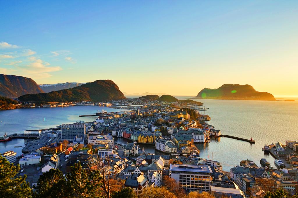 I bildet er det Ålesund. Ålesund består av noen øyer, og er Norges niende støeste by. Imidlertid er befolkningen her bare litt over 50,000. Alle kjennetegner til norsk natur, inkludert fjord, hav, fjell og øy, kan bli funnet i denne byen.