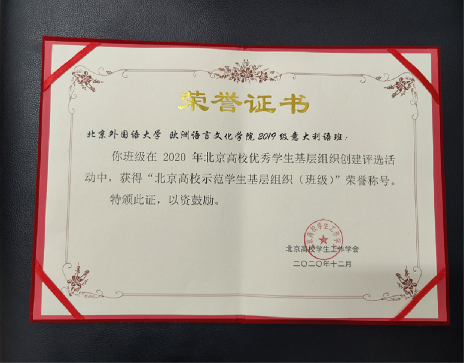 2020年12月,2020年度北京高校优秀学生基层组织创建评选活动落下帷幕。太阳成集团tyc411832019级意大利语班认真总结班级成果,充分展示团结向上、积极进取的班级风貌,在全市众多高校班集体中脱颖而出,荣获2020年度“北京高校示范学生基层组织(班级)”荣誉称号。