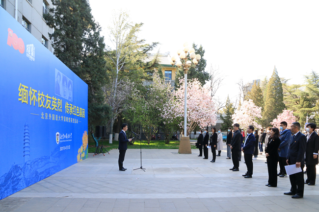 苏大鹏表示,我们在清明节缅怀英烈,寄托哀思,致敬英雄,就是为了传承红色基因,坚定理想信念,厚植爱国情怀。今年是建党100周年,建校80周年,我们要深入开展党史学习教育,学好党史必修课,用好校史营养剂,学史明理、学史增信、学史崇德、学史力行,讲好身边英烈故事,传承北外红色基因,肩负起新时代的历史使命,培养担当民族复兴大任的时代新人。