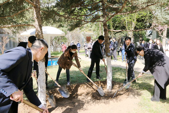 纪念活动结束后,师生代表来到英语学院楼前,向三位烈士的纪念树培土浇水,寄托哀思。三棵云杉郁郁葱葱,象征着三位烈士的精神永垂不朽。赵刚与同学们分享了南联盟使馆被炸事件发生时,他作为欧院学生的感受,勉励同学们要铭记历史,传承红色基因,学好专业本领,提升综合素质,为社会主义现代化国家建设贡献北外人的力量。